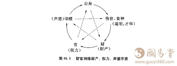 前文谈过,在八字的财官网络中,官被置于核心地位。在五行生克关系圈中(见图16.1 ),生官的一方是财,官所生的一方,是印绶。现代社会学对一个社会进行分析时,一般注重三个系列的社会层次地位。第一个是经济地位,也就是财产地位。有时用收人来折射财产,于是把人分成贫、富或不同收入的社会层次。第二个指标是权力。权力是指控制他人的能力。级别高的人,管的人就多,权力就自然分出层次来。第三个方面,是社会声望。如果说财产和权力,都是可以作客观的量度,声望则是比较主观的东西,是他人对一个人的评介。一个人有财产和权力,并不一定有声望。比如美国石汕大王洛克菲勒,很有钱,当时资产在世界排名前几位。他曾多次竞选美国总统,却屡屡败北,因为声望不高。而当年伊朗的宗教领袖霍梅尼,既无财产,也谈不上权力,后来声望地位日益升高,最后把国王给推翻了,成了伊斯兰教人的精神领袖。显然,财产、权力、声望这三者是不能等同的。