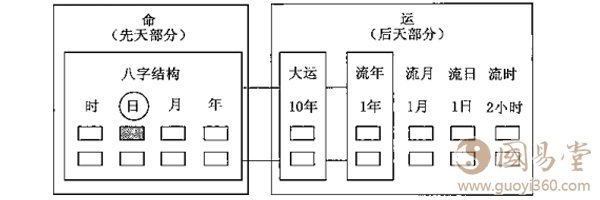 标准模型对个人命运的认识和描写分为两大部分命和运。命被看作先天部分,表现为根据个人出生时间排列出来的一个包括年、月、 日、时的干支结构一八字结构;运是后天部分,可以表现为大运、流年、流月、流日和流时,它们分别是由一个天干和一个地支组成的干支结构。