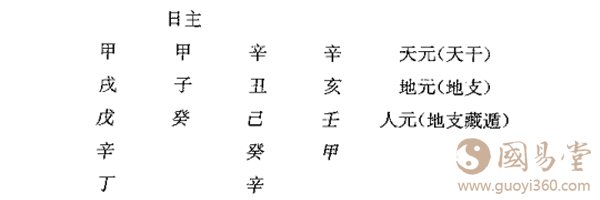 有了地支藏遁的转换,对于八字结构内的符号就可以进行直接的比较了。比如,上面的命例(北宋邵雍命造),可以将地支中的人元标记出来,这就为进一步 的分析作好了准备: