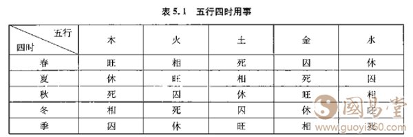这里,五行在四时(及长夏)中根据其旺衰程度分为五种状态。“王”(也作“旺”),是指当令得时状态(如春令木旺),即气最强盛的阶段。“相”有将旺的意思,它是旺者所生之气(如春令木旺,木生火,故火在春令为相)。“休”是指旺气已经过去,目前进入了休止阶段(如木旺于春令,到了夏季则进入休止状态)。处于休位上的气,也是生此时令当旺之气的气(如春令中,生旺木的正是处于休位上的水)。“囚” ,是受困,不能自主,乏力不振之意。处于囚位的五行,它是克当令旺气的。由于力不胜旺,只能入囚了(如春令之金)。“死”是指此时最弱的、完全丧失了力量的气。它正是此时当令旺气所克的五行(如春令木旺,木克土,土自然就处于死的状态了)。